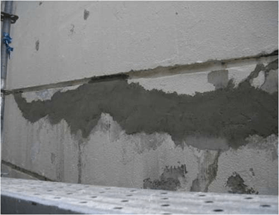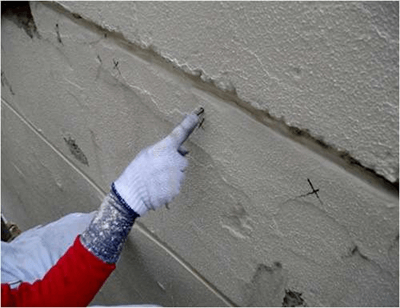 モルタルやコンクリート壁で見られる壁内部まで達しているような大きなひび割れでは、雨水の侵入により壁内部の木部・鉄などを腐食させてしまいます。