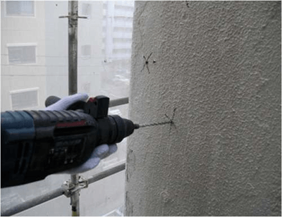 そのような欠損が見られた場合、浮きの範囲と状態を調べエポキシ樹脂により補修を行います。